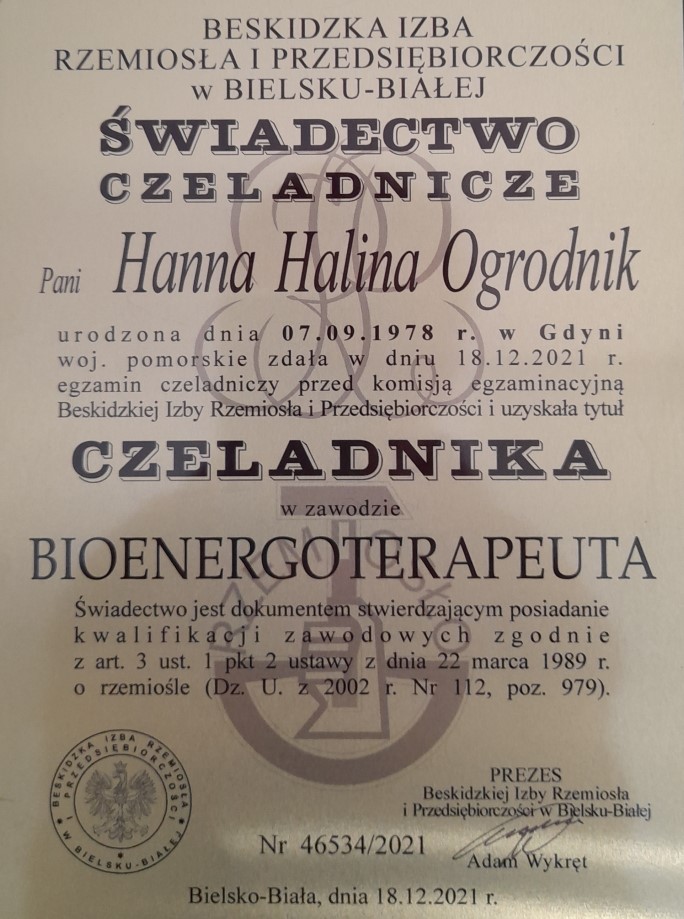 - Tytuł czeladnika z dziedziny bioenergoterapii